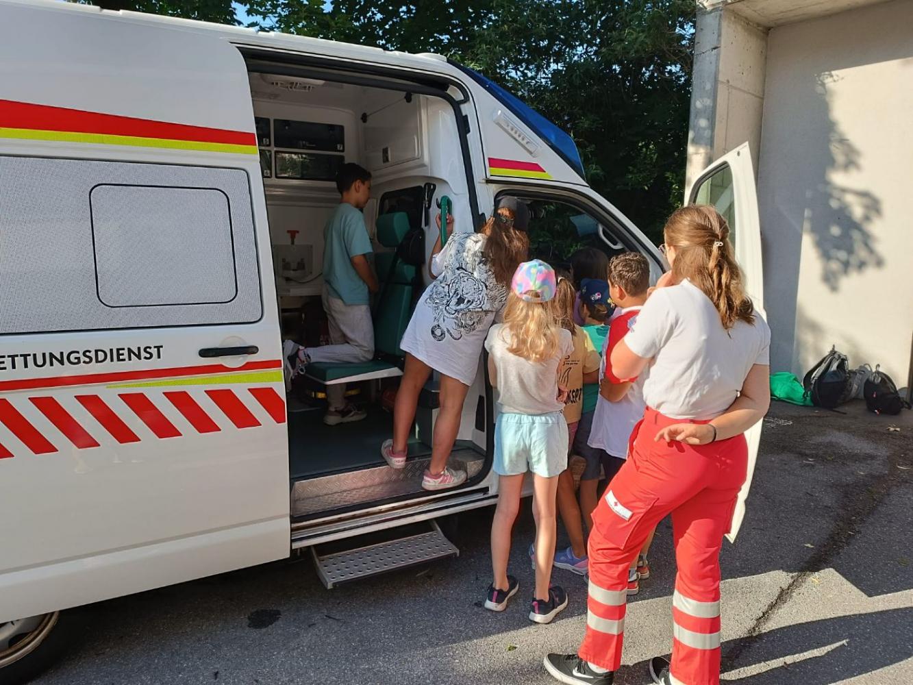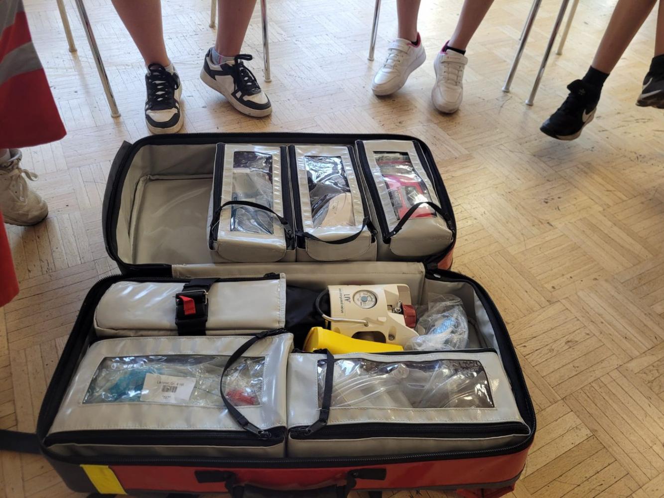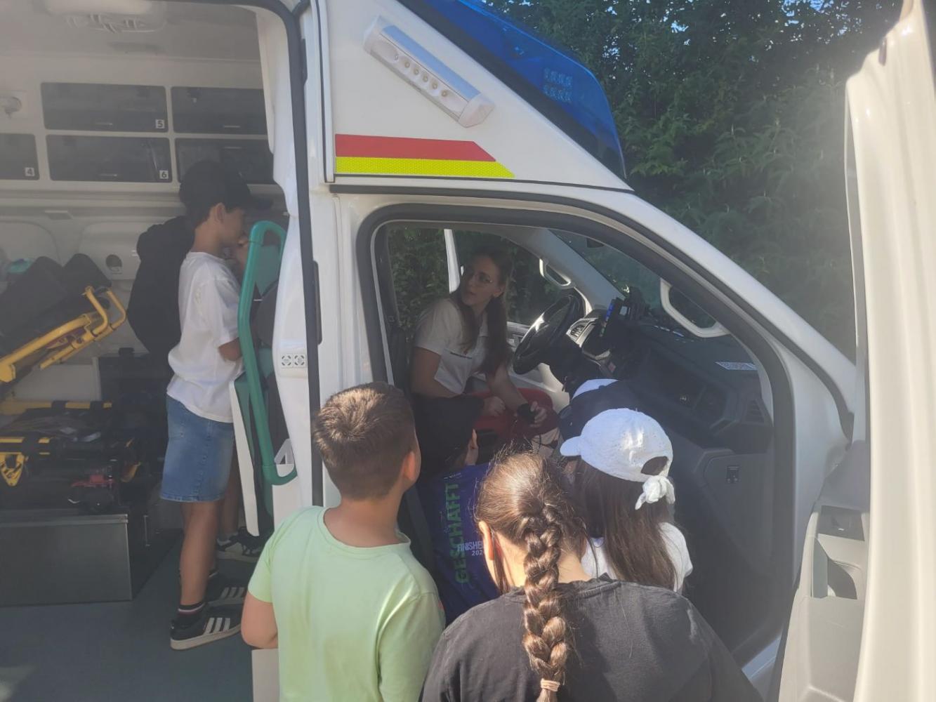 Zuerst stand der Besuch bei der Rettung auf dem Programm. Dort durften die Kinder ein Rettungsauto von innen besichtigen. Besonders spannend war der Blick in die Notfalltasche der Sanitäter: Diese wurde genau erklärt und sorgte für viele staunende Gesichter. Die Kinder erfuhren, wie vielfältig die Ausrüstung ist und wie im Notfall schnell geholfen werden kann.