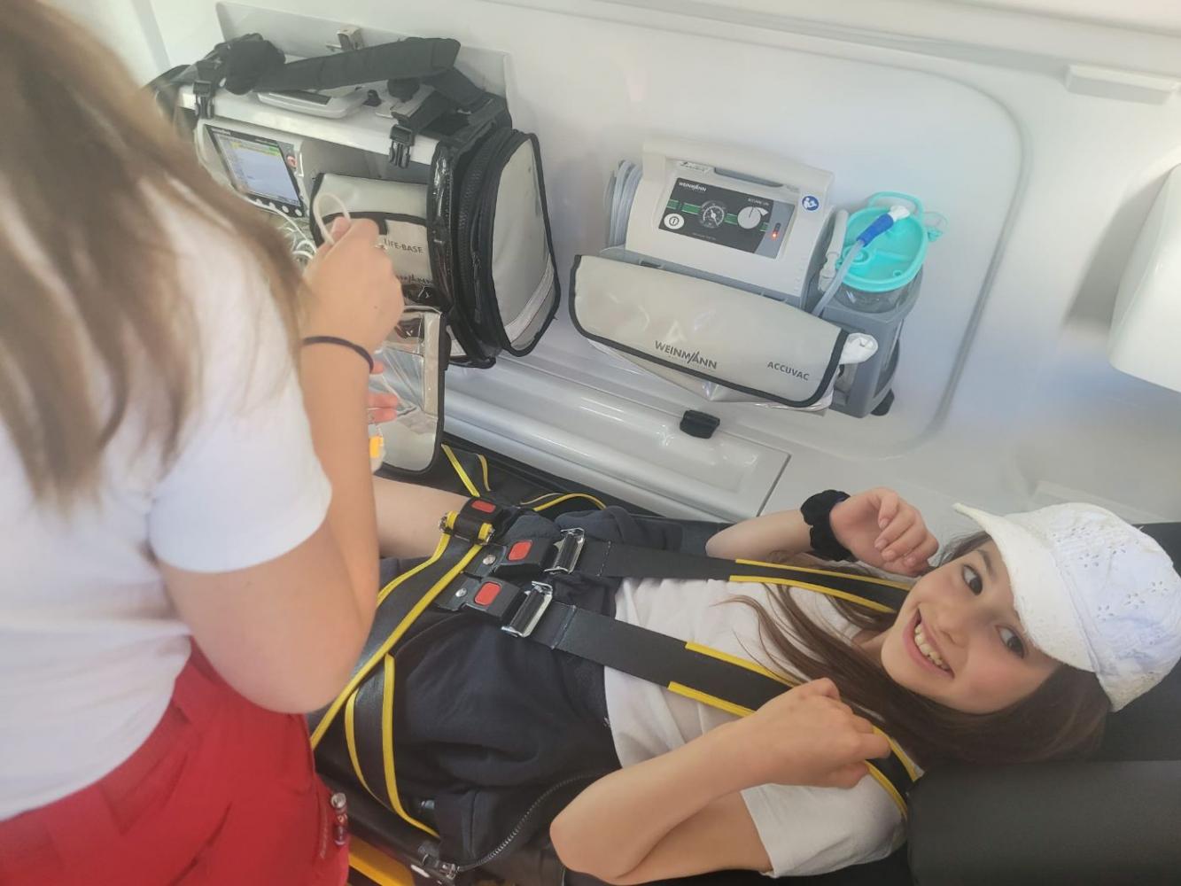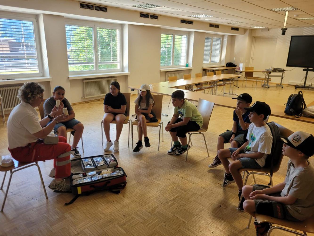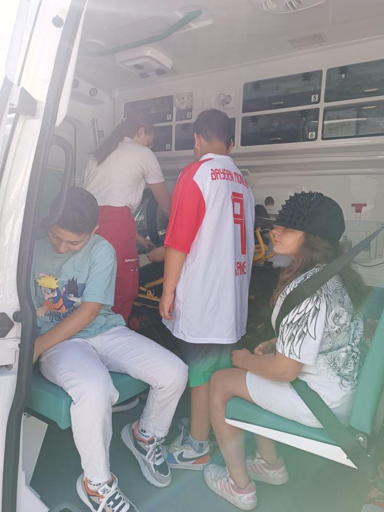 Zuerst stand der Besuch bei der Rettung auf dem Programm. Dort durften die Kinder ein Rettungsauto von innen besichtigen. Besonders spannend war der Blick in die Notfalltasche der Sanitäter: Diese wurde genau erklärt und sorgte für viele staunende Gesichter. Die Kinder erfuhren, wie vielfältig die Ausrüstung ist und wie im Notfall schnell geholfen werden kann.