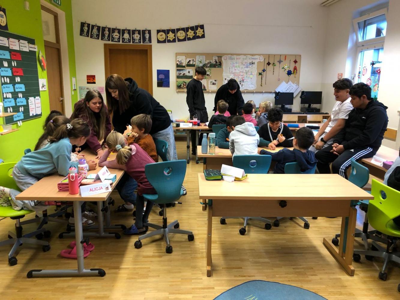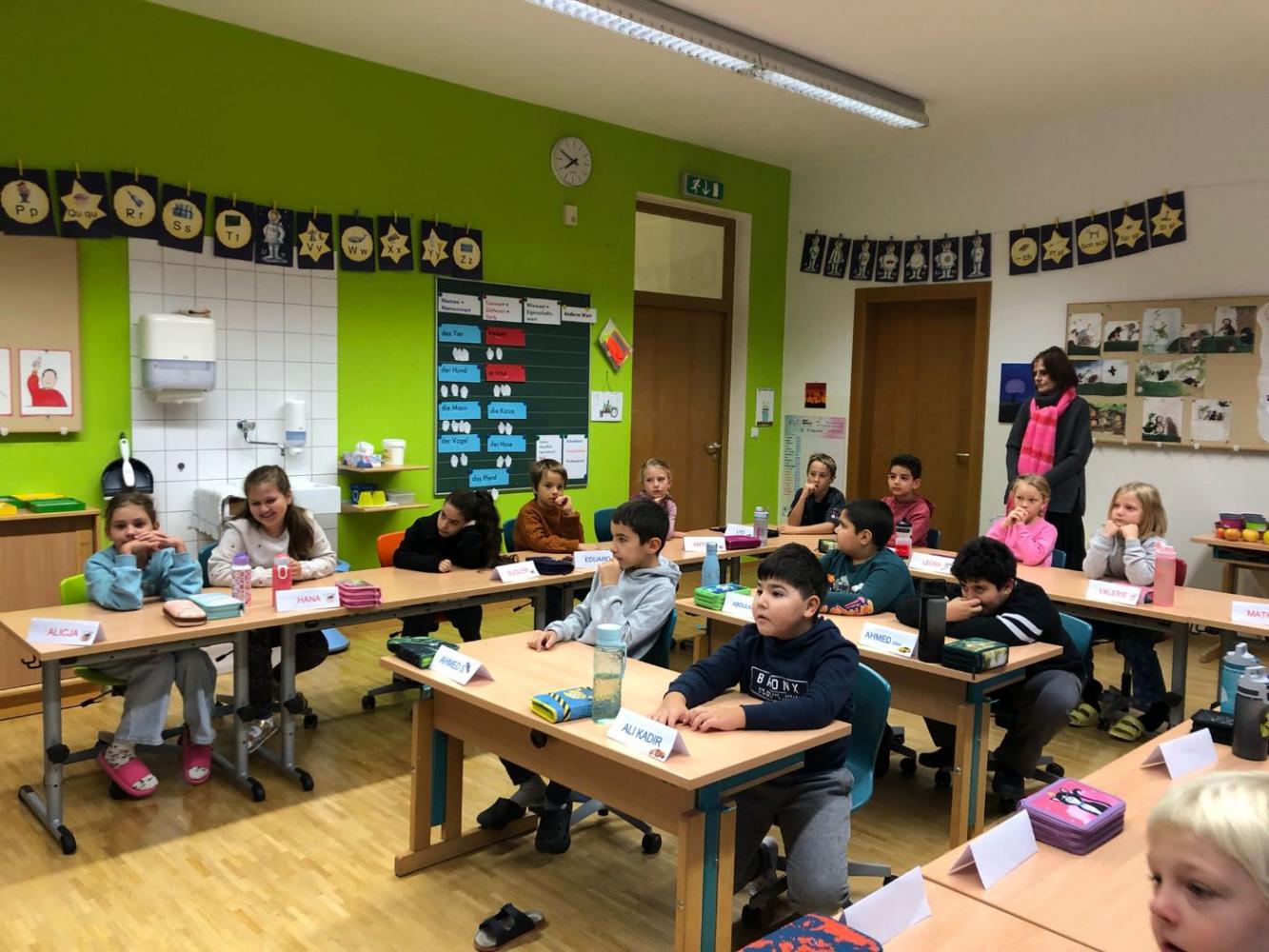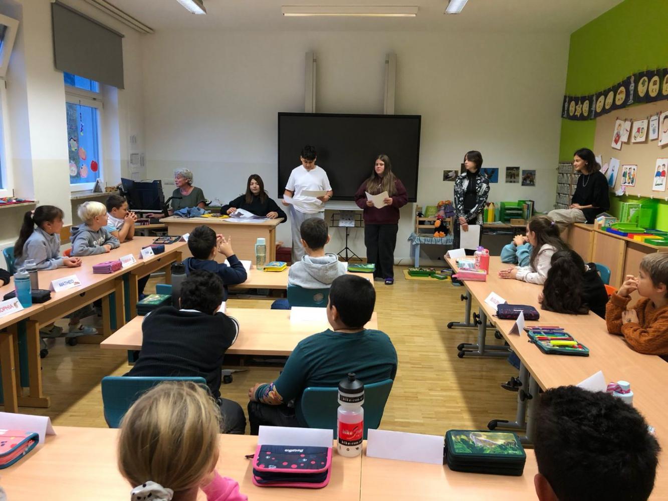 Die „Großen“ aus unserer Nachbarschule, der IT Mittelschule Oberstadt, eine Gruppe von acht SchülerInnen, besuchten unsere 2a- und 2b-Klasse für eine Vorlesestunde. Begleitet wurden sie von ihrer Lehrerin Monika Chebbo.
