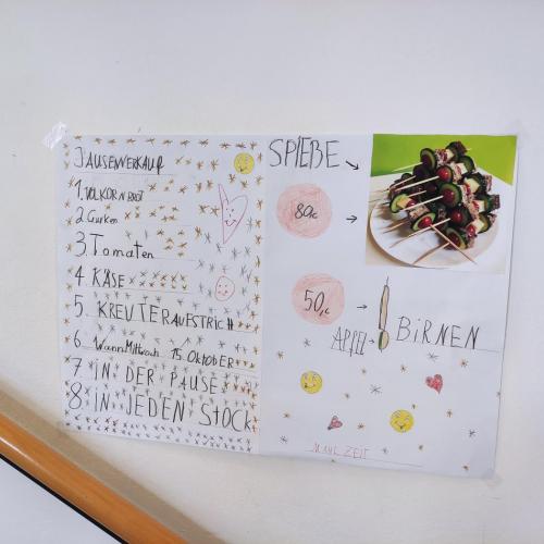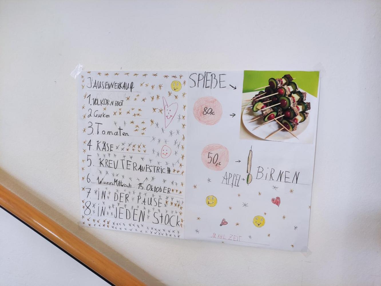 Mit viel Kreativität gestalteten die Schüler*innen bunte Plakate, um ihre Mitschüler auf den bevorstehenden Jausenverkauf aufmerksam zu machen.