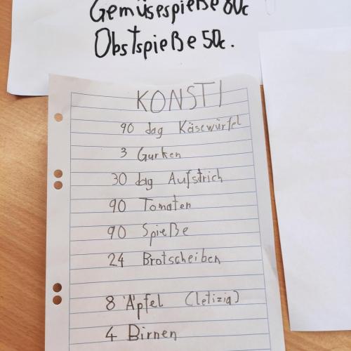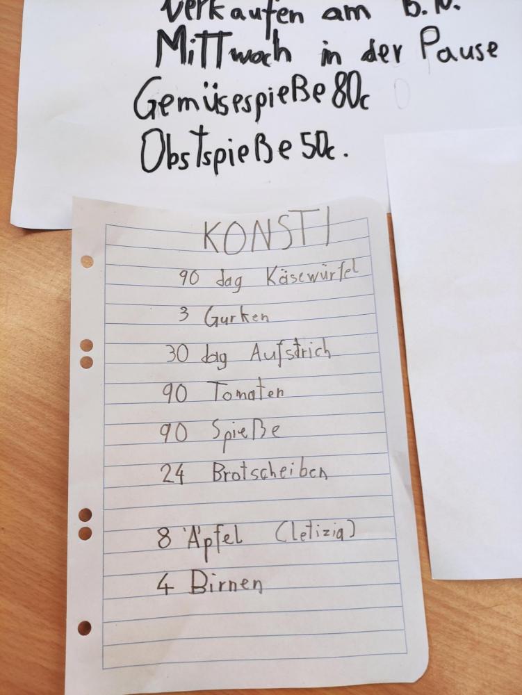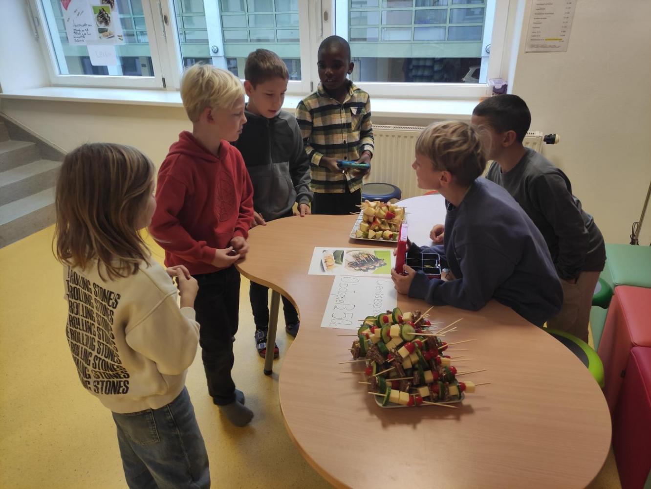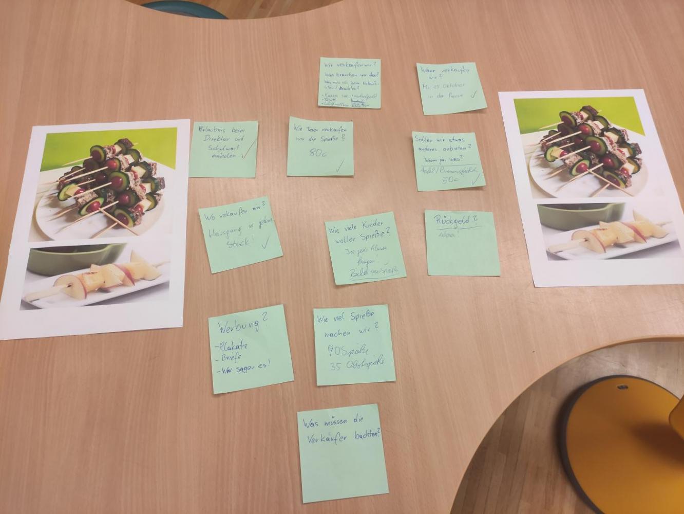 Um die richtige Menge an Spießen vorzubereiten, führten sie sogar eine kleine „Marktanalyse“ durch: In Kleingruppen besuchten sie die anderen Klassen und befragten die Schüler*innen nach ihrem Interesse.
