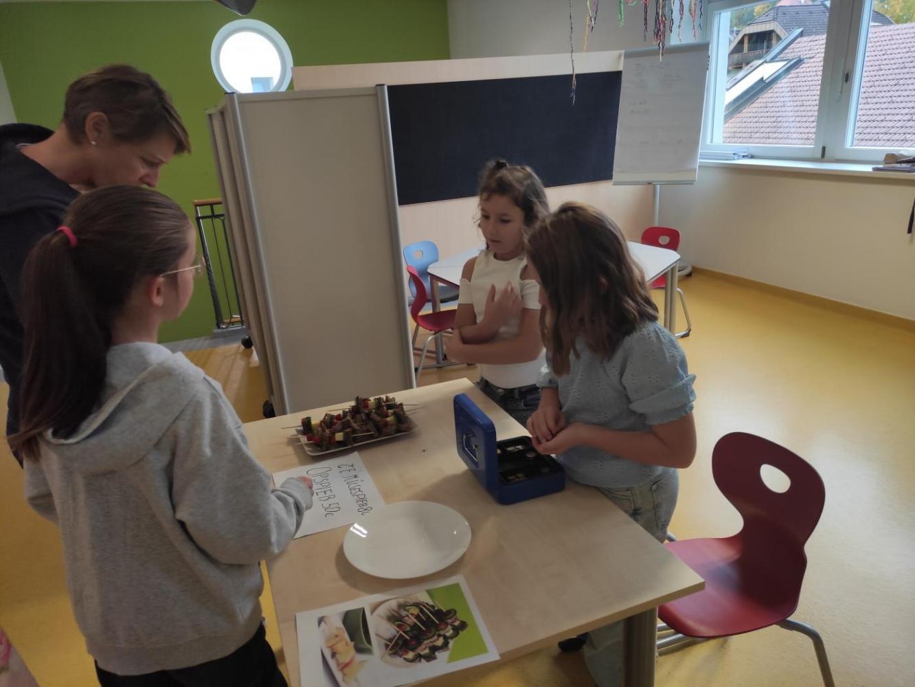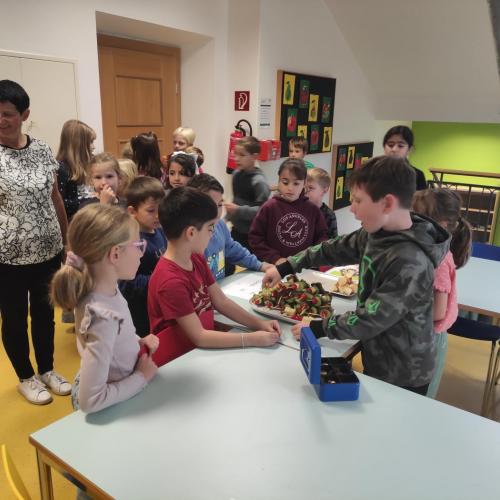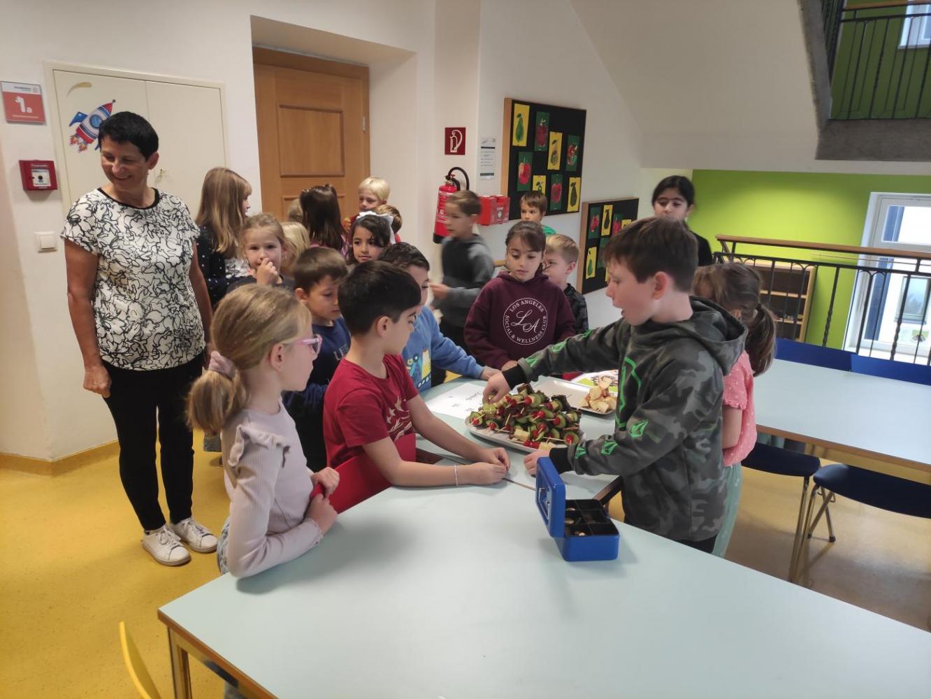 Dann wurde eingekauft! Eine Gruppe von Kindern machte sich – begleitet vom Lehrer – auf den Weg ins Lebensmittelgeschäft, um alle Zutaten selbstständig zu besorgen. Anschließend bereitete eine zweite Gruppe die Jausenspieße für die gesamte Klasse zu.